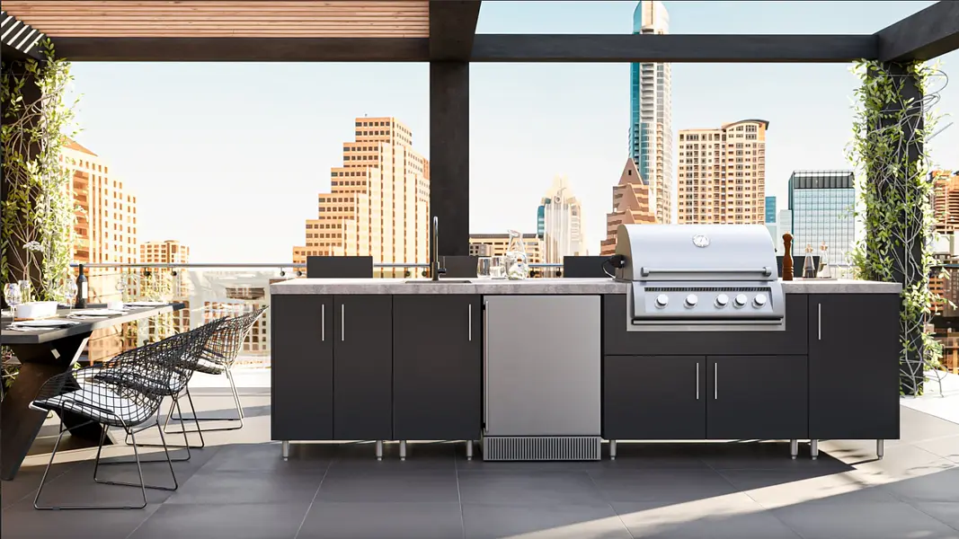 Four (5) Cabinets —> 48" Grill Base, 18" Side Burner Base, 18" Propane Drawer, 18" Trash Drawer, and 24" Sink Base. Enjoy beautiful, water-resistant cabinetry available in multiple colors and door designs, including hardware specifically made to withstand the elements.