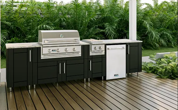 12.5' Outdoor Kitchen Island — 5 cabinets Deluxe Grill & Burner — 24" Beverage Cooler — 18" Sink — Ample Storage